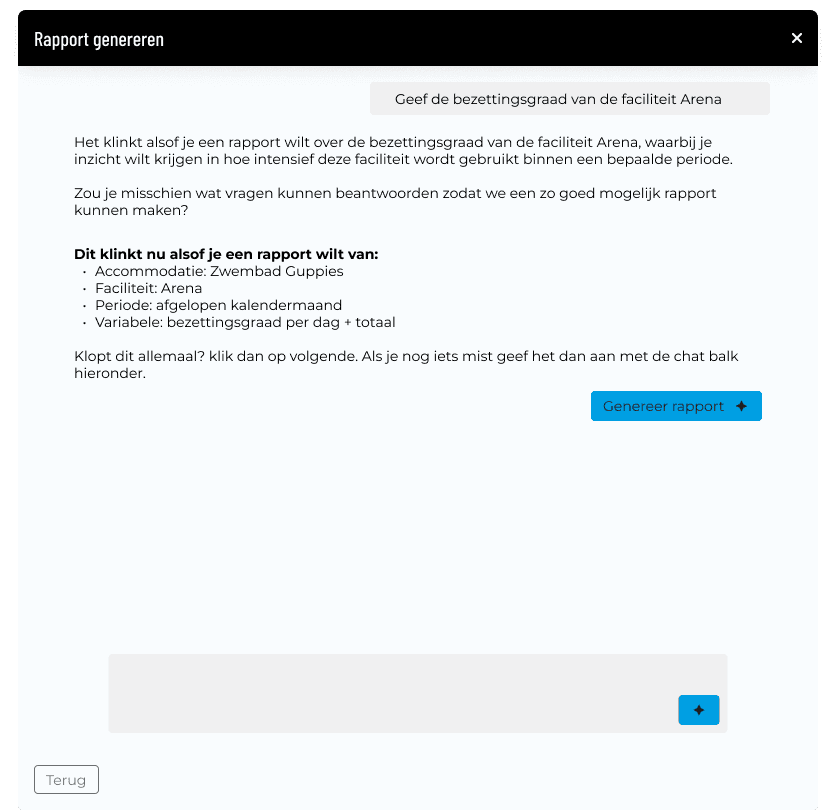 Daarnaast is binnen de ontwerpstrategie bewust gekozen voor transparantie en voorspelbaarheid. Gebruikers moeten vooraf kunnen begrijpen welke data wordt gebruikt en hoe het rapport wordt opgebouwd. Door inzicht te geven in de structuur van het rapport voordat het wordt gegenereerd, blijft de gebruiker in controle en voelt de AI niet als een ondoorzichtige oplossing. Deze keuze is direct gebaseerd op de behoefte aan vertrouwen en controle die uit het onderzoek naar voren kwam (Zie bijlage 2, Onderzoeksrapportage, Pagina 8–11).