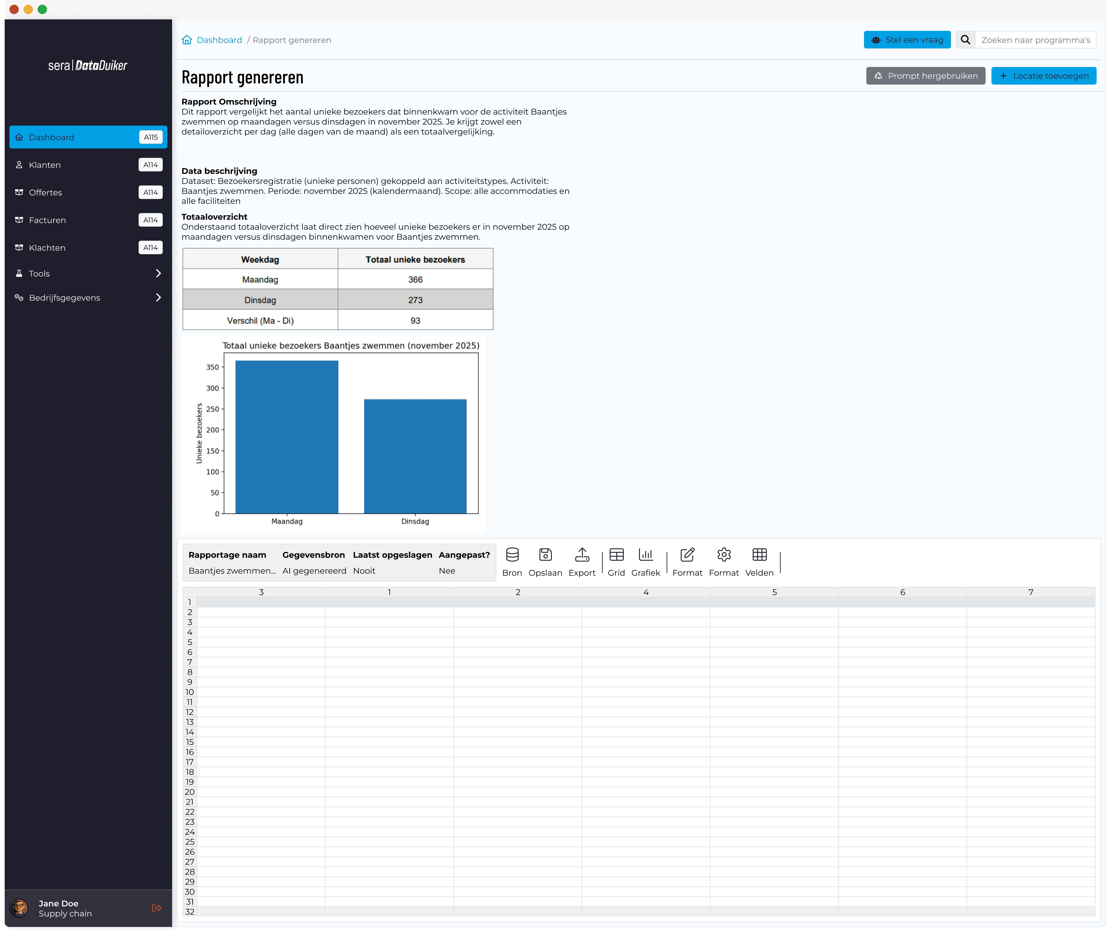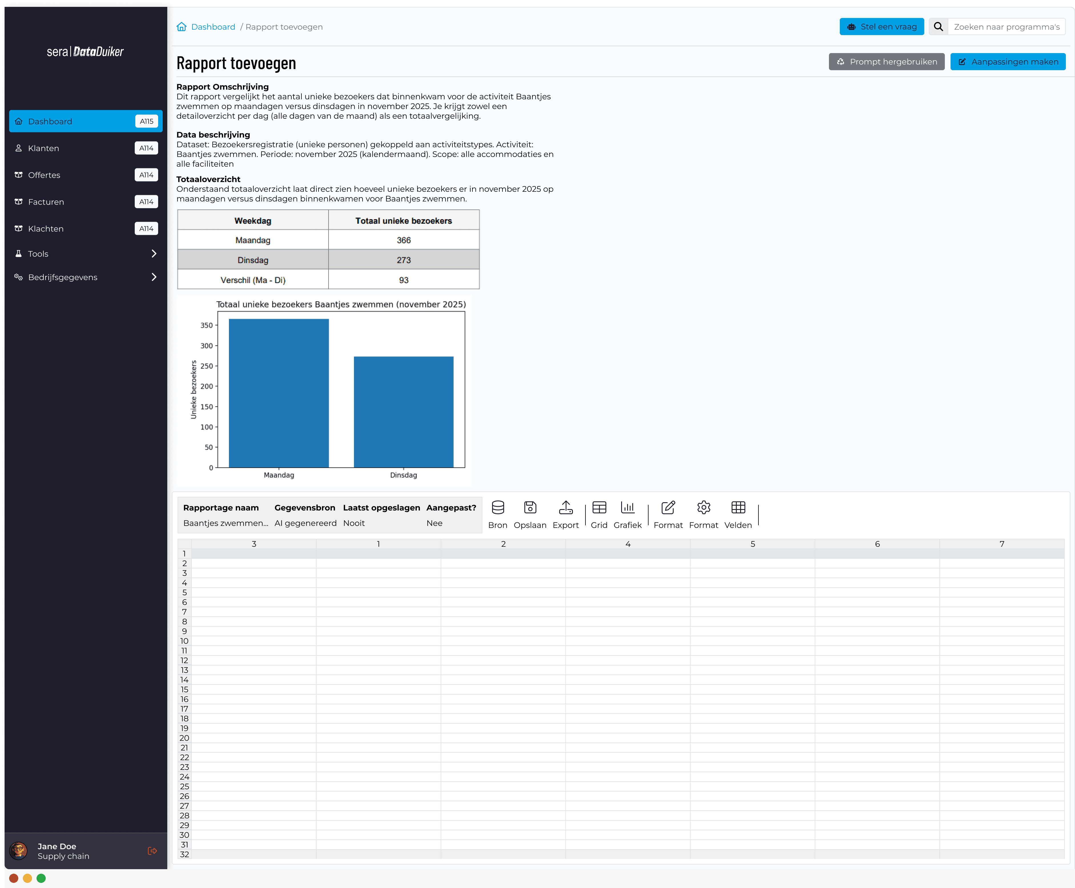 Binnen Dataduiker is veel data beschikbaar over zwembaden, lessen en cursisten. Hoewel deze data waardevol is, blijkt het voor gebruikers lastig om hier zelfstandig bruikbare rapporten uit te halen. In de huidige situatie nemen klanten daarom regelmatig contact op met Sera om rapporten te laten samenstellen, wat zorgt voor extra werkdruk en vertraging in het proces (Zie bijlage 2, Onderzoeksrapportage, Pagina 1–3).
