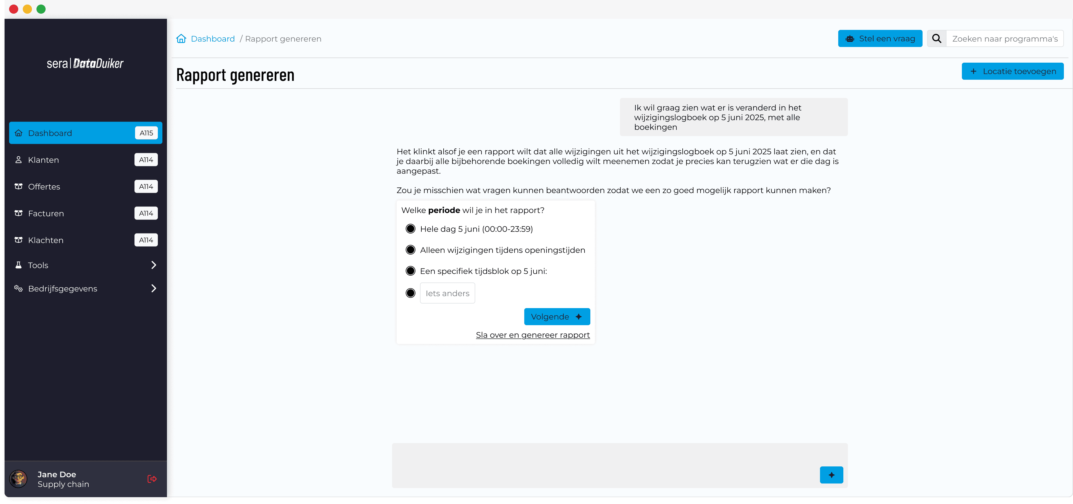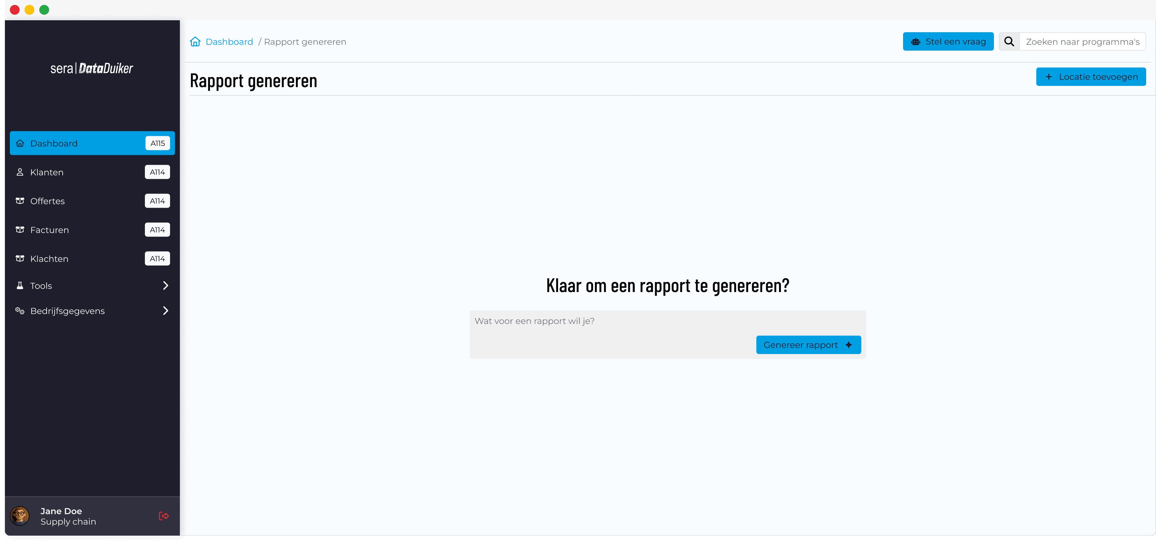 Het doel van dit project was om een AI-functionaliteit te ontwerpen waarmee gebruikers zelfstandig rapporten kunnen genereren binnen Dataduiker, zonder afhankelijk te zijn van ondersteuning vanuit Sera. Daarbij lag de focus niet op het maximaliseren van AI-mogelijkheden, maar op het ondersteunen van gebruikers bij het stellen van de juiste vraag (Zie bijlage 1, Plan van aanpak, Pagina 3–4).