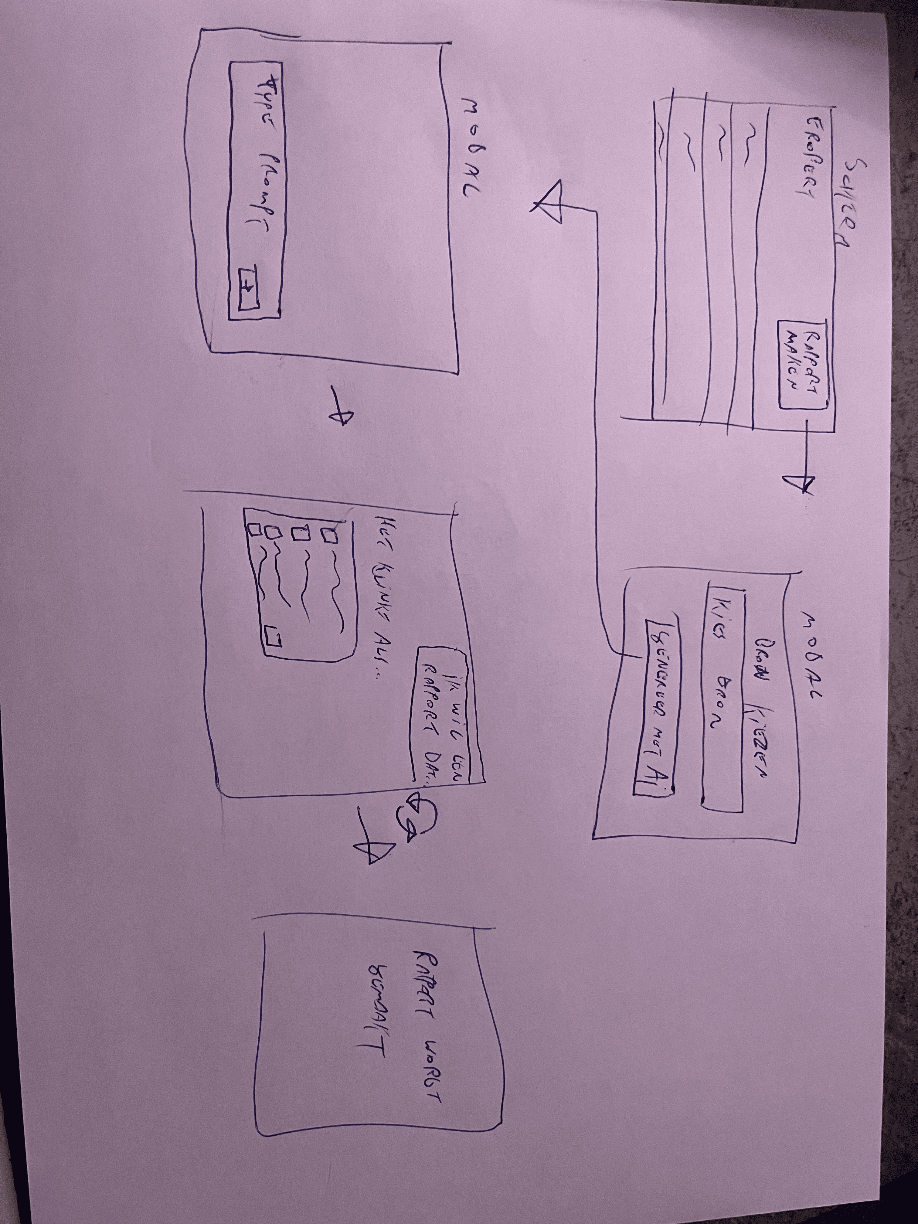 In de eerste iteratie is een low-fidelity wireframe opgesteld waarin de volledige gebruikersflow is uitgewerkt. Deze flow beschrijft hoe gebruikers starten met een beginprompt en vervolgens stap voor stap door de wizard worden geleid tot het genereren van een rapport (zie Figuur 1, de flow van het rapporten genereren). De wireframe diende als basis om de logica en volgorde van stappen te bepalen, zonder afleiding van visuele details.